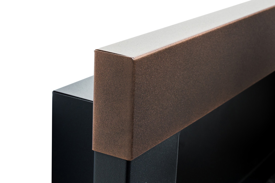 Plechy sú precízne opracované a striekané čiernou práškovou žiaruvzdornou farbou. Na spodku a vrchu biokrbu sú umiestnené hnedé lišty z nerezového plechu. Vďaka nízkej hmotnosti ho môžete zavesiť na sadrokartónovú stenu alebo s použitím izolácie aj zabudovať.