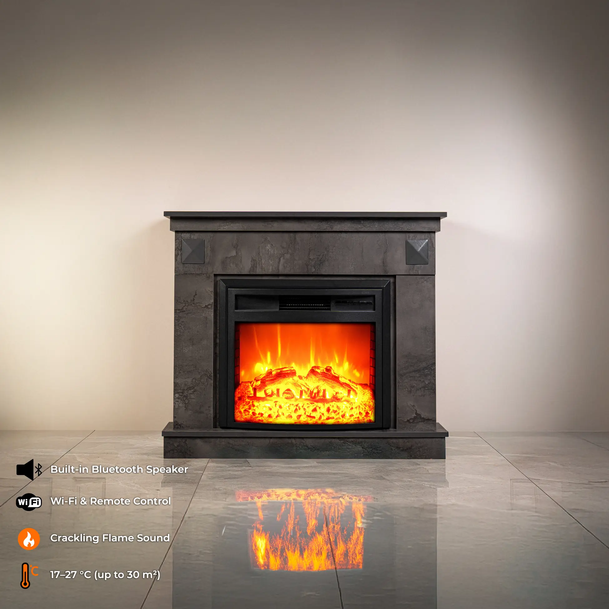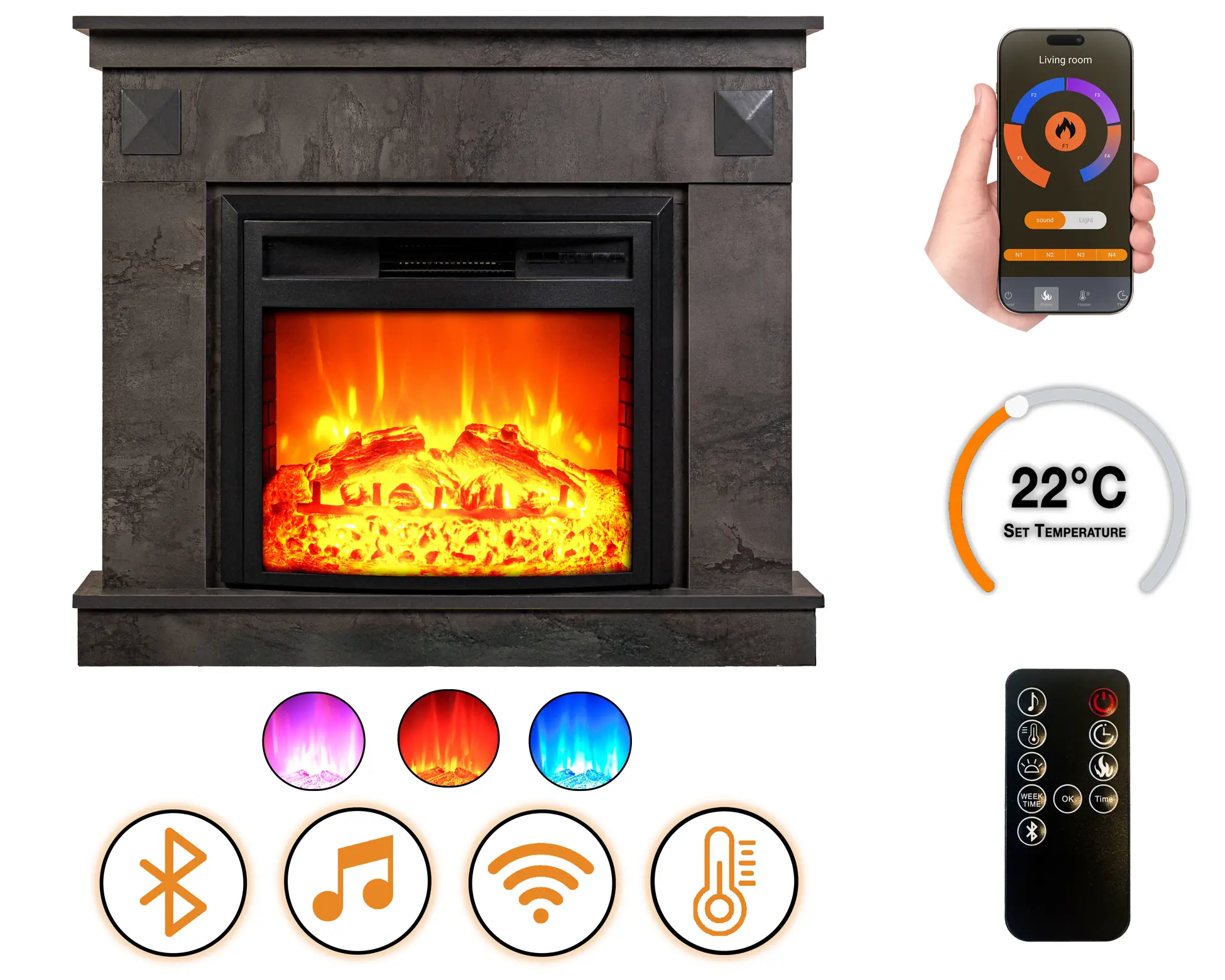 Irony Gray EF 4 je vybavený funkciou Bluetooth reproduktora a Wi-Fi pripojením, čo umožňuje jednoduchú integráciu s mobilnými aplikáciami. Krb je možné ovládať na diaľku cez mobilnú aplikáciu, diaľkový ovládač alebo priamo tlačidlami na jednotke. Programovateľný časovač s nastavením od 30 minút do 9 hodín pridáva ďalšie pohodlie.