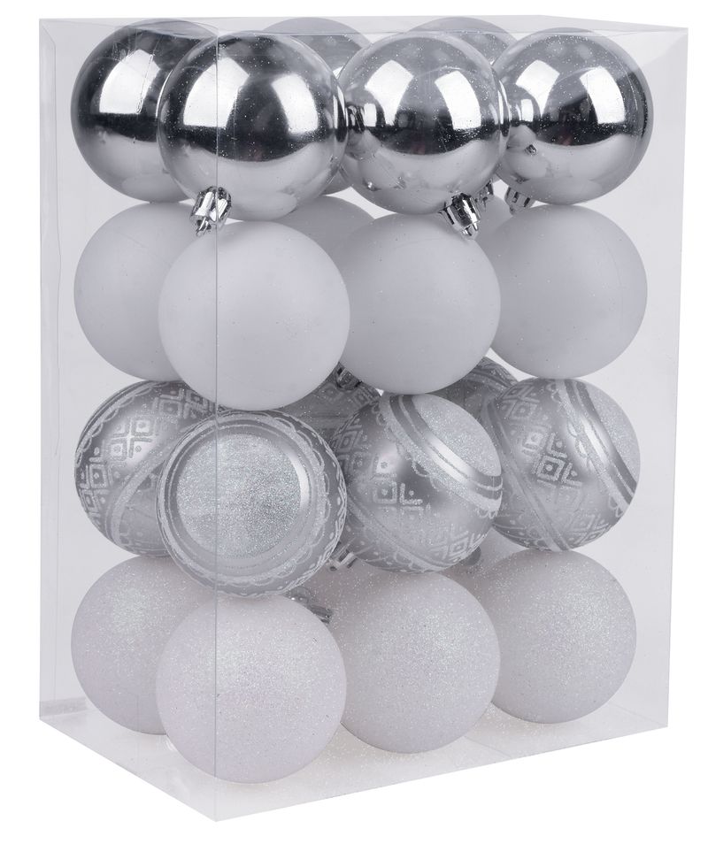 Súprava ozdôb na stromček slúži na slávnostné ozdobenie vianočného stromčeka. Pozostáva z 24 ks vianočných gulí s priemerom 6 cm. Farba gulí je bielo-strieborná. Sú vyrobené z plastu.
