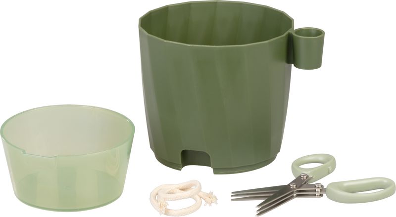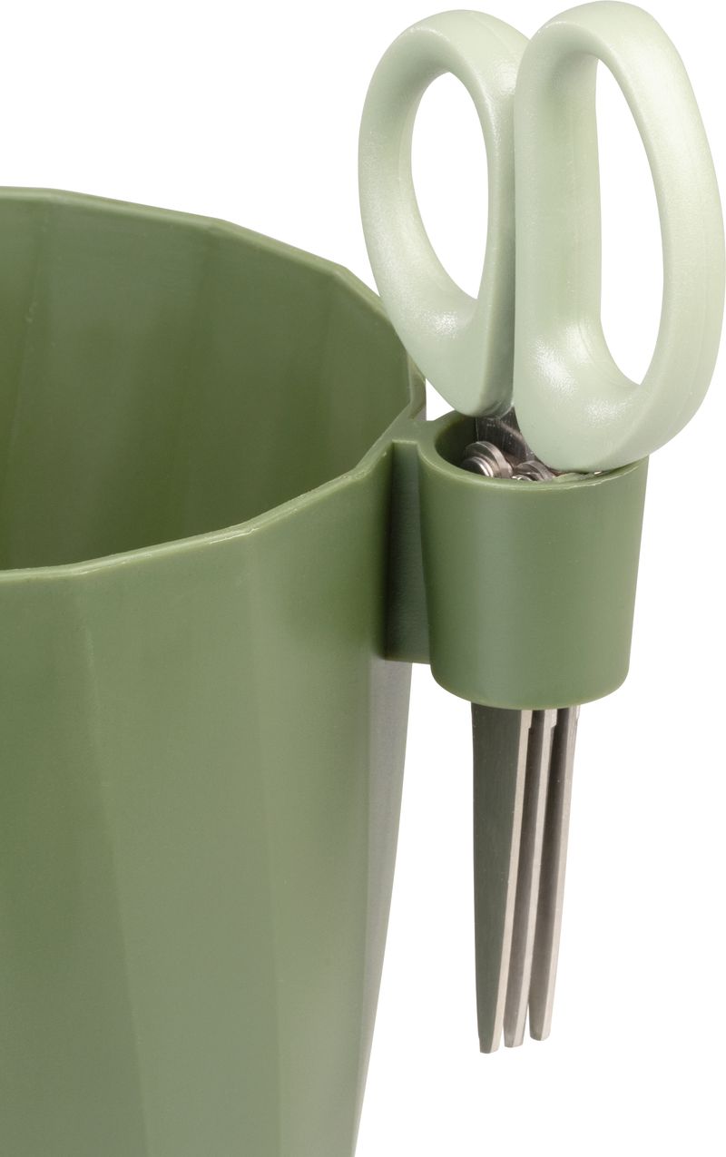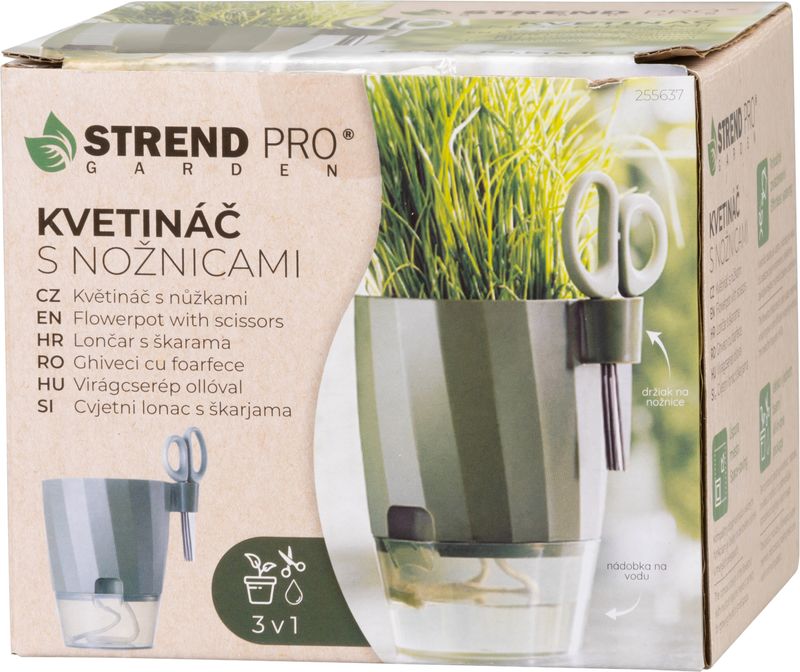 Kvetináč na bylinky Strend Pro so záhradníckymi nožnicami v zelenej farbe je praktickým riešením pre každého pestovateľa byliniek a menších rastlín.