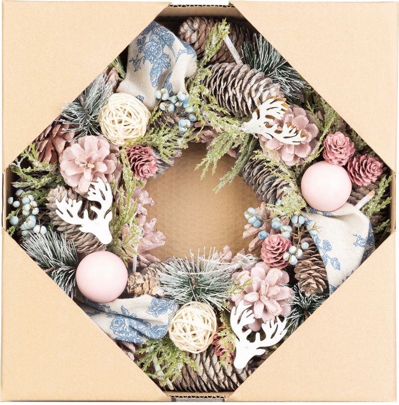 Dizajnový vianočný veniec MagicHome prinesie do vášho domova nádych elegancie a sviatočnej atmosféry. Veniec je zdobený prírodnými šiškami, dekoratívnymi kvetmi a ozdobnými guľôčkami v ružovo-modrých tónoch, ktoré vytvárajú moderný a pritom teplý vzhľad.